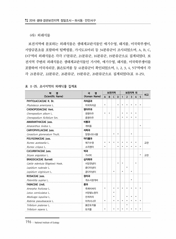 2016 생태·경관보전지역 정밀조사 하시동 · 안인사구 196 ? National Institute of Ecology 학 명 Scientific Name 국 명 Korean Name 보전지역 보전지역 외 비고 A B C D 1 2 3 4 5 PHYTOLACCACEAE R. Br. 자리공과 Phytolacca americana L. 미국자리공 * * * * * * * CHENOPODIACEAE Vent. 명아주과 Chenopodium album L. 흰명아주 * * * * * * Chenopodium ficifolium Sm. 좀명아주 * * * * * AMARANTHACEAE Juss. 비름과 Amaranthus lividus L. 개비름 * CARYOPHYLLACEAE Juss. 석죽과 Cerastium...