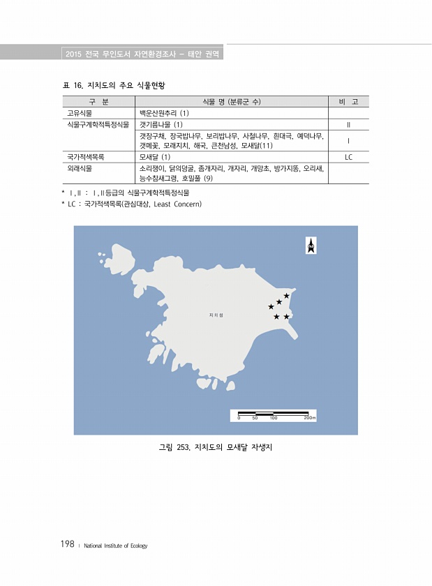 2015 전국 무인도서 자연환경조사 태안 권역 198 ? National Institute of Ecology 구 분 식물 명 분류군 수 비 고 고유식물 백운산원추리 1 식물구계학적특정식물 갯기름나물 1 Ⅱ 갯장구채, 장국밥나무, 보리밥나무, 사철나무, 흰대극, 예덕나무, 갯메꽃, 모래지치, 해국, 큰천남성, 모새달 11 Ⅰ 국가적색목록 모새달 1 LC 외래식물 소리쟁이, 닭의덩굴, 좀개자리, 개자리, 개망초, 방가지똥, 오리새, 능수참새그령, 호밀풀 9 표 16. 지치도의 주요 식물현황 * Ⅰ,Ⅱ Ⅰ,Ⅱ등급의 식물구계학적특정식물 * LC 국가적색목록 관심대상, Least Concern 그림 253. 지치도의 모새달자생지