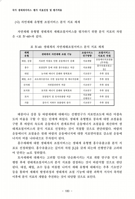 국가 생태계서비스 평가 지표선정 및 평가적용 180 나 자연재해 유형별 조절서비스 분석 지표 체계 자연재해 유형별 생태계의 재해조절서비스를 평가하기 위한 분석 지표의 차원 은 표 Ⅳ 60 과 같다. 재해 유형 생태계의 자연재해 조절 기능 조절서비스 연구방향 지표의 조절서비스 차원 태풍, 강풍 지표면 마찰로 인한 운동에너지 감쇄 지표개발 운동에너지조절율 무차원 홍수 토양침투 등에 의한 홍수유출고 저감 지표개발 홍수유출조절고 [L] 대설 눈사태 에너지 감쇄와 방벽효과 기초연구 추후 결정 해일, 조수 조도계수증가로 수면 상승저감 및 에너지감쇄 기초연구 추후 결정 산사태 사면붕괴면적 저감 기초연구 추후 결정 토석류 토석류 에너지 감쇄와 방벽효과 기초연구 추후 결정 토사 토양침식 및 토사유출량 저감 지표개발 선행연구...