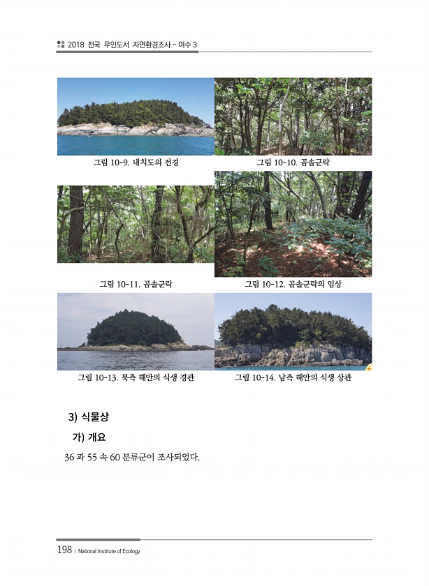2018 전국 무인도서 자연환경조사 여수 3 198 ? National Institute of Ecology 그림 10-9. 내치도의 전경 그림 10-10. 곰솔군락 그림 10-11. 곰솔군락 그림 10-12. 곰솔군락의 임상 그림 10-13. 북측 해안의 식생 경관 그림 10-14. 남측 해안의 식생 상관 3 36 과 55 속 60 분류군이조사되었다.