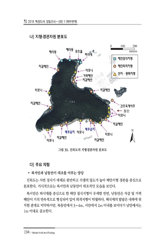 2018 특정도서 정밀조사 신안 1 북부권역 194 ? National Institute of Ecology ? 그림 30. 진목도의 지형경관자원 분포도 ? 북서안과 남동안이 대조를 이루는 양상 진목도는 사면 경사가 대체로 완만하고 식생의 밀도가 높아 해안지형 경관을 중심으로 분포한다. 거시적으로는 북서안과 남동안이 대조적인 모습을 보인다. 북서안은 파식대를 중심으로 한 해안 침식지형이 우세한 반면, 남동안은 자갈 및 거력 해안이 거의 연속적으로 형성되어 있어 퇴적지형이 탁월하다. 해식애의 발달은 내해에 위 치한 관계로 미약하지만, 북동안에서 3∼4m, 서안에서 2m 이내를 보이다가 남안에서는 1m 이내로감소한다.