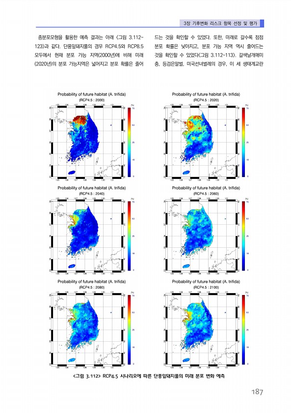 3장 기후변화 리스크 항목 선정 및 평가 187 종분포모형을 활용한 예측 결과는 아래 그림 3.112123 과 같다. 단풍잎돼지풀의 경우 RCP4.5와 RCP8.5 모두에서 현재 분포 가능 지역 2000년 에 비해 미래 2020년 의 분포 가능지역은 넓어지고 분포 확률은 줄어 드는 것을 확인할 수 있었다. 또한, 미래로 갈수록 점점 분포 확률은 낮아지고, 분포 가능 지역 역시 줄어드는 것을 확인할 수 있었다 그림 3.112113 갈색날개매미 충, 등검은말벌, 미국선녀벌레의 경우, 이 세 생태계교란 그림 3.112 RCP4.5 시나리오에 따른 단풍잎돼지풀의 미래 분포 변화예측