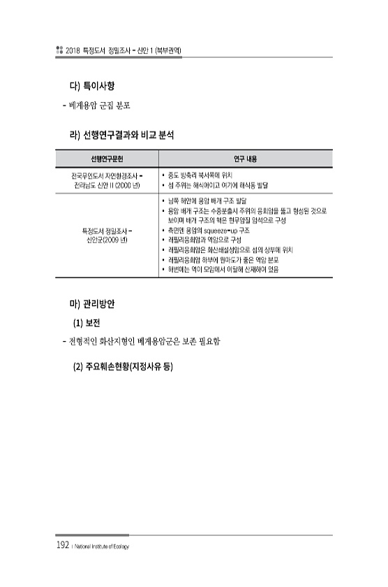 2018 특정도서 정밀조사 신안 1 북부권역 192 ? National Institute of Ecology 베게용암 군집 분포 선행연구문헌 연구 내용 전국무인도서 자연환경조사 전라남도 신안 II 2000 년 ? 중도 방축리 북서쪽에 위치 ? 섬 주위는 해식애이고 여기에 해식동 발달 특정도서 정밀조사 ? 신안군 2009 년 ? 남쪽 해안에 용암 배개 구조 발달 ? 용암 배개 구조는 수중분출시 주위의 응회암을 뚫고 형성된 것으로 보이며 배개 구조의 핵은 현무암질 암석으로 구성 ? 측면엔 용암의 squeeze-up 구조 ? 래필리응회암과 역암으로 구성 ? 래필리응회암은 화산쇄설성암으로 섬의 상부에 위치 ? 래필리응회암 하부에 원마도가 좋은 역암 분포 ? 해변에는 역이 모암에서 이탈해 산재하여 있음 1 전형적인 ...