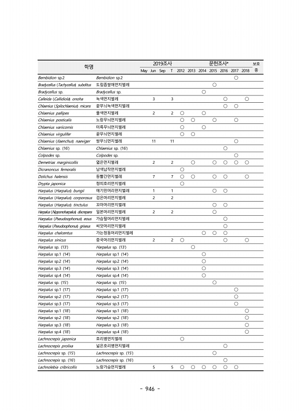 946 학명 2019조사 문헌조사* 보호 May Jun Sep T 2012 2013 2014 2015 2016 2017 2018 종 Bembidion sp.2 Bembidion sp.2 ? Bradycellus Tachycellus subditus 도림좁쌀애먼지벌레 ? Bradycellus sp. Bradycellus sp. ? Calleida Callidiola onoha 녹색먼지벌레 3 3 ? ? Chlaenius Spilochlaenius micans 끝무늬녹색먼지벌레 ? ? Chlaenius pallipes 풀색먼지벌레 2 2 ? ? Chlaenius posticalis 노랑무늬먼지벌레 ? ? ? ? Chlaenius variicornis 미륵무늬먼지벌레 ? ? Chlaenius virgulifer ...