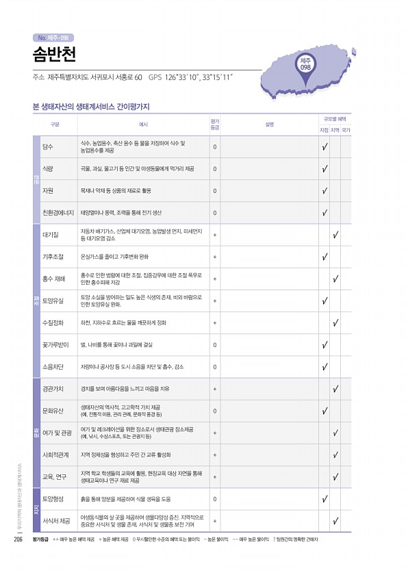 No. 제주- 제주 098 본 생태자산의 생태계서비스 간이평가지 구분 예시 평가 등급 설명 규모별 혜택 지점 지역 국가 공급 담수 식수, 농업용수, 축산 용수 등 물을 저장하여 식수 및 농업용수를 제공 0 √ 식량 곡물, 과실, 물고기 등 인간 및 야생동물에게 먹거리 제공 0 √ 자원 목재나 약재 등 상품의 재료로 활용 0 √ 친환경에너지 태양열이나 풍력, 조력을 통해 전기 생산 0 √ 조절 대기질 자동차 배기가스, 산업체 대기오염, 농업발생 먼지, 미세먼지 등 대기오염 감소 + √ 기후조절 온실가스를 줄이고 기후변화 완화 + √ 홍수 재해 홍수로 인한 범람에 대한 조절, 집중강우에 대한 조절 폭우로 인한 홍수피해 저감 + √ 토양유실 토양 소실을 방어하는 밀도 높은 식생의 존재, 비와 바람으로 인한 토양유...