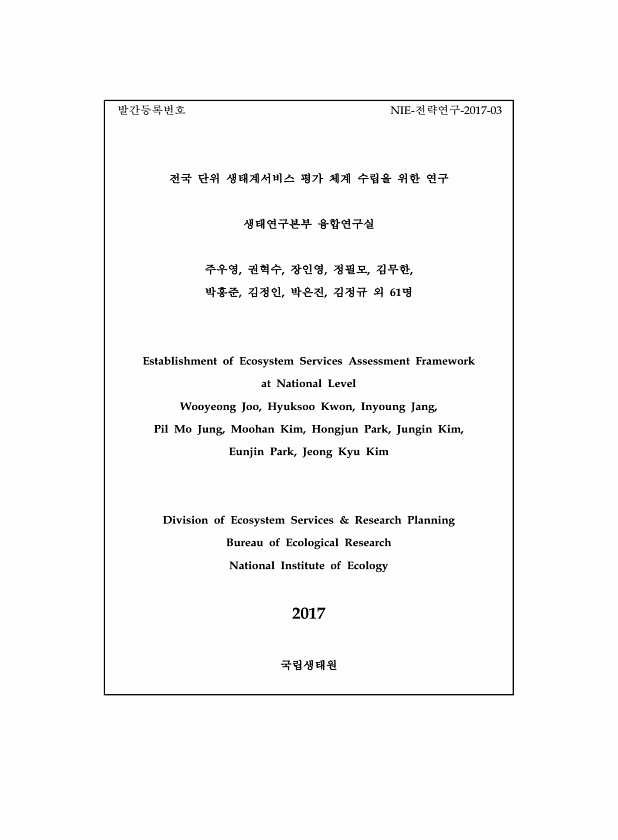 발간등록번호 NIE-전략연구-2017-03 전국 단위 생태계서비스 평가 체계 수립을 위한 연구 생태연구본부 융합연구실 주우영, 권혁수, 장인영, 정필모, 김무한, 박홍준, 김정인, 박은진, 김정규 외 61명 Establishment of Ecosystem Services Assessment Framework at National Level Wooyeong Joo, Hyuksoo Kwon, Inyoung Jang, Pil Mo Jung, Moohan Kim, Hongjun Park, Jungin Kim, Eunjin Park, Jeong Kyu Kim Division of Ecosystem Services & Research Planning Bureau of Ecological Research National...