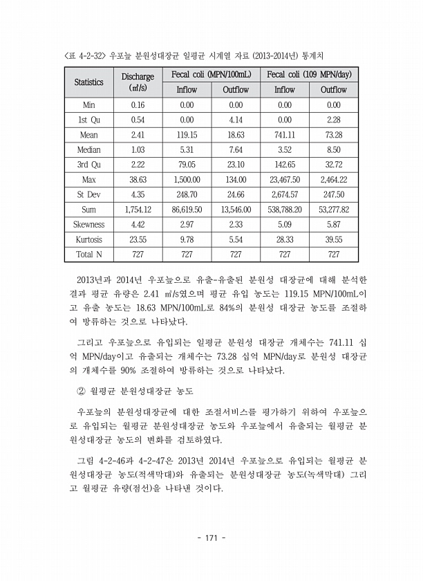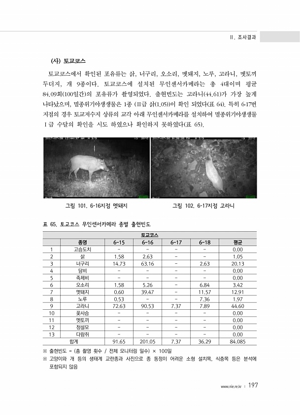 Ⅱ. 조사결과 www.nie.re.kr ? 197 사 토교코스 토교코스에서 확인된 포유류는 삵, 너구리, 오소리, 멧돼지, 노루, 고라니, 멧토끼 두더지, 개 9종이다. 토교코스에 설치된 무인센서카메라는 총 4대이며 평균 84.09회 100일간 의 포유류가 촬영되었다. 출현빈도는 고라니 44.61 가 가장 높게 나타났으며, 멸종위기야생생물은 1종 Ⅱ급 삵 1.05 이 확인 되었다 표 64 특히 6-17번 지점의 경우 토교저수지 상류의 교각 아래 무인센서카메라를 설치하여 멸종위기야생생물 Ⅰ급 수달의 확인을 시도 하였으나 확인하지 못하였다 표 65 그림 101. 6-16지점 멧돼지 그림 102. 6-17지점 고라니 토교코스 종명 6-15 6-16 6-17 6-18 평균 1 고슴도치 0.00 2 삵 1.58 2....