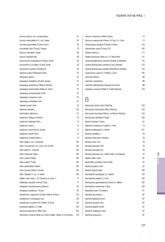 207 색인 Index 국립생태원 보유식물 목록집 Ⅰ Aruncus dioicus var. kamtschaticus 91 Aruncus aethusifolius H. Lev. Nakai 91 Arundina graminifolia D.Don Hochr. 32 Arundinella hirta Thunb. Tanaka 73 Asarum maculatum Nakai 26 Asarum sieboldii Miq. 26 Ascocentrum ampullaceum Roxb. Schltr. 32 Ascocentrum curvifolium Lindl. Schltr. 32 Ascocentrum garayi Christenson 32 Asimina incana W.Bartram Exell 27 Asparagus albus L....