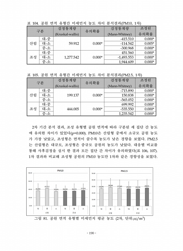 190 구분 검정통계량 유의확률 검정통계량 조정된 유의확률 산림 대 중 대 소 중 소 조성 대 중 대 소 중 소 표 공원 면적 유형간 미세먼지 농도 차이 분석결과 차 구분 검정통계량 유의확률 검정통계량 조정된 유의확률 산림 대 중 대 소 중 소 조성 대 중 대 소 중 소 표 공원 면적 유형간 미세먼지 농도 차이 분석결과 차 차 기간 분석 결과 조성 유형별 공원 면적에 따라 구분된 세 집단 간 농도 에 유의한 차이가 있었다 은 산림형 중에서 소규모 공원 농도 가 가장 낮았고 조성형은 면적이 클수록 농도가 낮은 경향을 보였다 는 산림형은 대규모 조성형은 중규모 공원의 농도가 낮았다 대응별 비교를 통해 사후검정을 실시 한 결과 모든 집단 간 차이가 유의하였다 표 차 결과와 비교해 조성형 공원의 농도만 차와 같은 ...