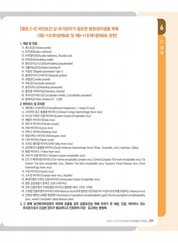 환경부 유전자변형생물체 안전관리 가이드 _209 6 별 표 3 [별표 2-3] 국민보건 상 국가관리가 필요한 병원성미생물 목록 제2-1조제1항제4호 및 제9-11조제1항제4호 관련 1. 세균 및 진균 가. 페스트균 Yersinia pestis 나. 탄저균 Bacillus anthracis 다. 브루셀라균 Brucella melitensis, Brucella suis 라. 비저균 Burkholderia mallei 마. 멜리오이도시스균 Burkholderia pseudomallei 바. 보툴리눔균 Clostridium botulinum 사. 이질균 Shigella dysenteriae Type 1 아. 클라미디아 프시타키 Chlamydia psittaci 자. 큐열균 Coxiella burnetii 차. 야토...