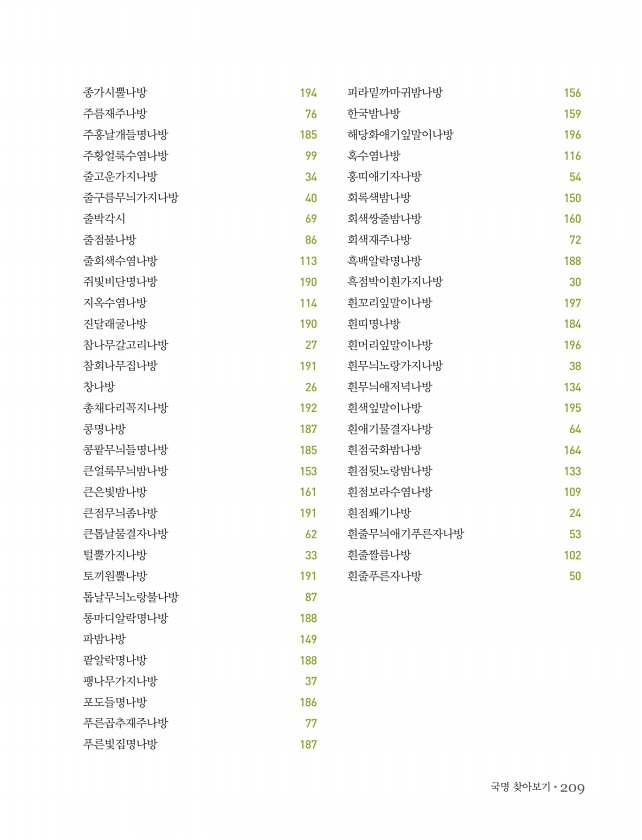 국명 찾아보기?209 종가시뿔나방 194 주름재주나방 76 주홍날개들명나방 185 주황얼룩수염나방 99 줄고운가지나방 34 줄구름무늬가지나방 40 줄박각시 69 줄점불나방 86 줄회색수염나방 113 쥐빛비단명나방 190 지옥수염나방 114 진달래굴나방 190 참나무갈고리나방 27 참회나무집나방 191 창나방 26 총채다리꼭지나방 192 콩명나방 187 콩팥무늬들명나방 185 큰얼룩무늬밤나방 153 큰은빛밤나방 161 큰점무늬좀나방 191 큰톱날물결자나방 62 털뿔가지나방 33 토끼원뿔나방 191 톱날무늬노랑불나방 87 통마디알락명나방 188 파밤나방 149 팥알락명나방 188 팽나무가지나방 37 포도들명나방 186 푸른곱추재주나방 77 푸른빛집명나방 187 피라밑까마귀밤나방 156 한국밤나방 159 해당화애...