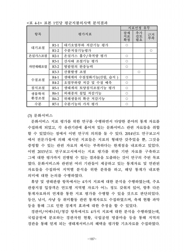 -187- 항목 평가지표 지표선정 유무 잠재 지표 확정 추가 검토 필요 근거 부족 대기조절 대기오염부하 저감기능 평가 수분저장기능평가 온실가스조절 온실가스 흡수 축적량 평가 자연재해조절 산사태 조절기능 평가 범람원의 완충능력 산불발생 조절 수질조절 생태계의 수질정화기능 산림 습지 오염부하량 저감 및 수질 예측 침식조절 생태계의 토양침식조절기능 평가 생물학적 환경조절 외래종의 침입 저감기능 위해생물의 확산 저감기능 수분 수분기능의 가치 평가 표 표본 인당 평균지불의사액 분석결과 문화서비스 문화서비스 지표 평가를 위한 연구를 수행하면서 다양한 분야의 통계 자료를 수집하게 되었고 각 유관기관에 흩어져 있는 문화서비스 관련 자료들을 취합 할 수 있었다는 점에서 이번 연구의 의의를 둘 수 있다 년도 연구보고서 에서 ...