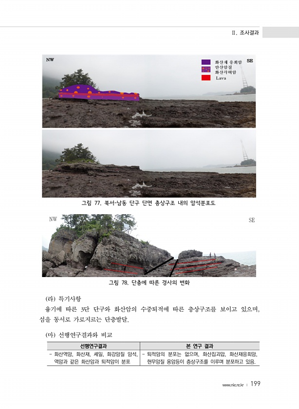 Ⅱ. 조사결과 www.nie.re.kr ? 199 그림 77. 북서-남동 단구 단면 층상구조 내의 암석분포도 그림 78. 단층에 따른 경사의 변화 라 특기사항 융기에 따른 3단 단구와 화산암의 수중퇴적에 따른 층상구조를 보이고 있으며, 섬을 동서로 가로지르는 단층발달. 마 선행연구결과와 비교 선행연구결과 본 연구 결과 화산역암, 화산재, 셰일, 화강암질 암석, 역암과 같은 화산암과 퇴적암이 분포 퇴적암의 분포는 없으며, 화산집괴압, 화산재응회암, 현무암질 용암등이 층상구조를 이루며 분포하고있음.