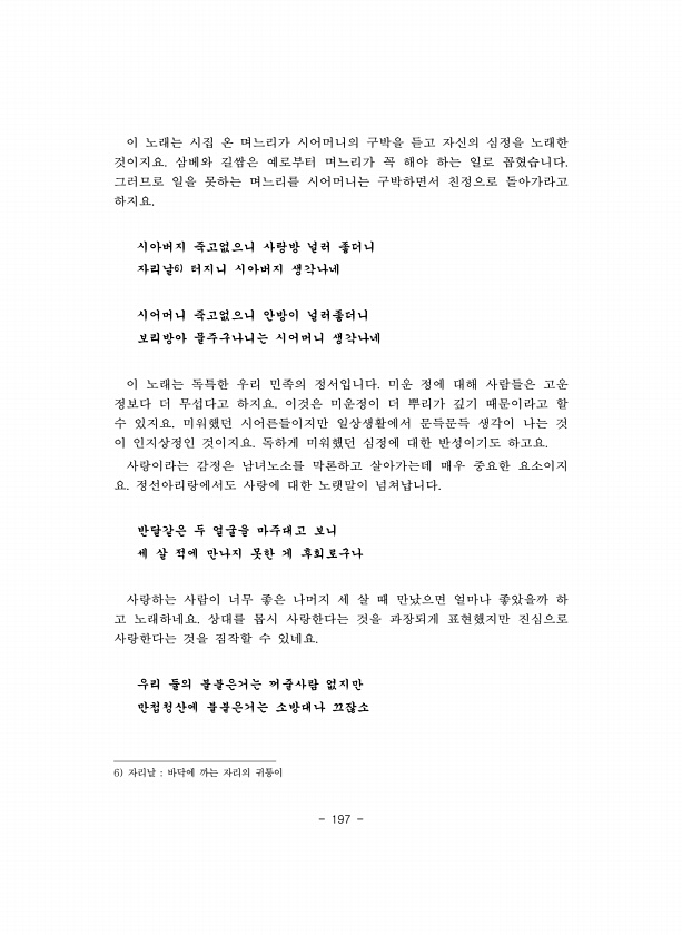 197 이 노래는 시집 온 며느리가 시어머니의 구박을 듣고 자신의 심정을 노래한 것이지요 삼베와 길쌈은 예로부터 며느리가 꼭 해야 하는 일로 꼽혔습니다 그러므로 일을 못하는 며느리를 시어머니는 구박하면서 친정으로 돌아가라고 하지요 시아버지 죽고없으니 사랑방 널러 좋더니 자리날6 터지니 시아버지 생각나네 시어머니 죽고없으니 안방이 널러좋더니 보리방아 물주구나니는 시어머니 생각나네 이 노래는 독특한 우리 민족의 정서입니다 미운 정에 대해 사람들은 고운 정보다 더 무섭다고 하지요 이것은 미운정이 더 뿌리가 깊기 때문이라고 할 수 있지요 미워했던 시어른들이지만 일상생활에서 문득문득 생각이 나는 것 이 인지상정인 것이지요 독하게 미워했던 심정에 대한 반성이기도 하고요 사랑이라는 감정은 남녀노소를 막론하고 살아가는데 ...