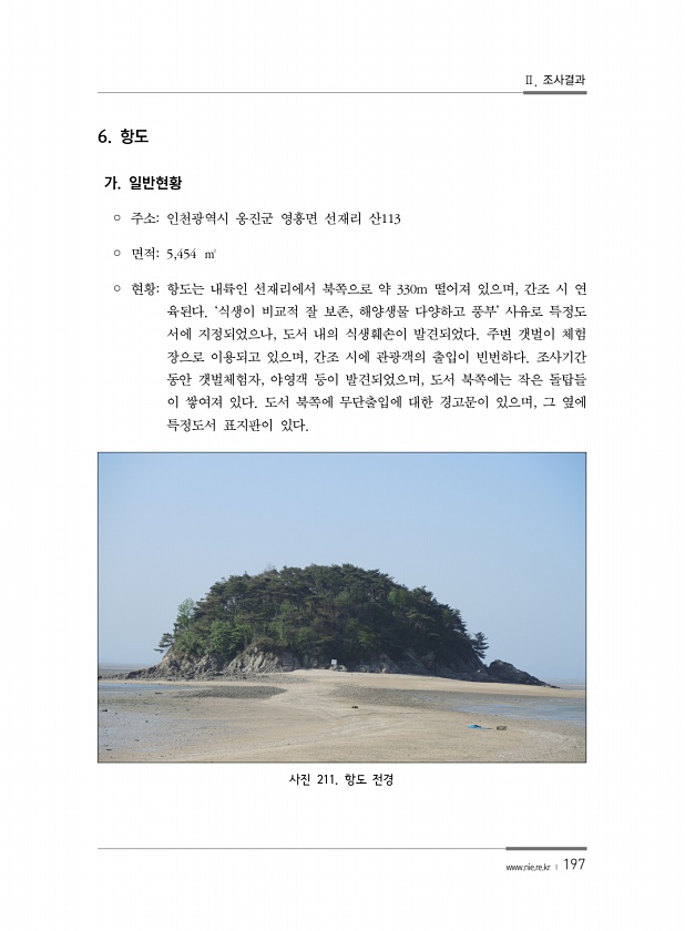 Ⅱ. 조사결과 www.nie.re.kr ? 197 6. 항도 가. 일반현황 ? 주소인천광역시 옹진군 영흥면 선재리 산113 ? 면적5,454 ㎡ ? 현황항도는 내륙인 선재리에서 북쪽으로 약 330m 떨어져 있으며, 간조 시 연 육된다. ‘식생이 비교적 잘 보존, 해양생물 다양하고 풍부’ 사유로 특정도 서에 지정되었으나, 도서 내의 식생훼손이 발견되었다. 주변 갯벌이 체험 장으로 이용되고 있으며, 간조 시에 관광객의 출입이 빈번하다. 조사기간 동안 갯벌체험자, 야영객 등이 발견되었으며, 도서 북쪽에는 작은 돌탑들 이 쌓여져 있다. 도서 북쪽에 무단출입에 대한 경고문이 있으며, 그 옆에 특정도서 표지판이 있다. 사진 211. 항도전경
