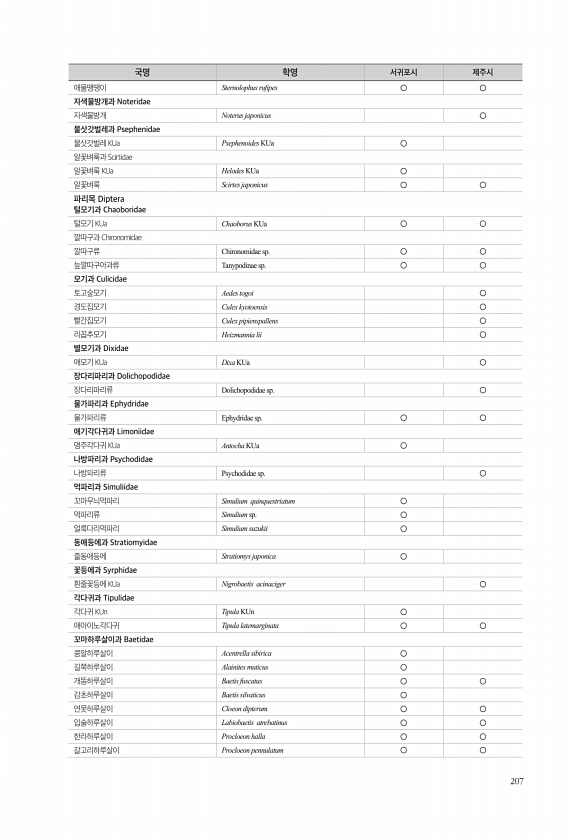 207 애물땡땡이 Sternolophus rufpes ○ ○ 자색물방개과 Noteridae 자색물방개 Noterus japonicus ○ 물삿갓벌레과 Psephenidae 물삿갓벌레 KUa Psephenoides KUa ○ 알꽃벼룩과 Scirtidae 알꽃벼룩 KUa Helodes KUa ○ 알꽃벼룩 Scirtes japonicus ○ ○ 파리목 Diptera 털모기과 Chaoboridae 털모기 KUa Chaoborus KUa ○ ○ 깔따구과 Chironomidae 깔따구류 Chironomidae sp. ○ ○ 늪깔따구아과류 Tanypodinae sp. ○ ○ 모기과 Culicidae 토고숲모기 Aedes togoi ○ 경도집모기 Culex kyotoensis ○ 빨간집모기 Culex pipienspall...