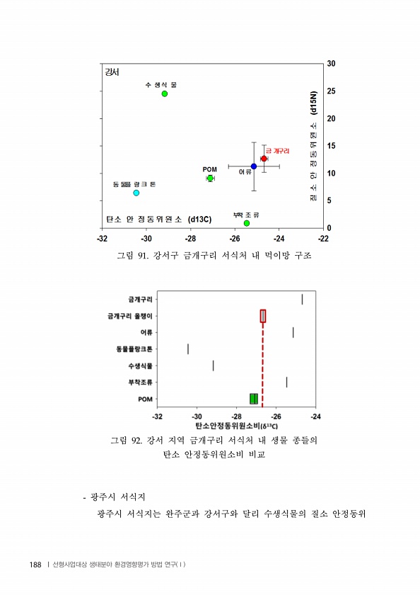 그림 강서구 금개구리 서식처 내 먹이망 구조 그림 강서 지역 금개구리 서식처 내 생물 종들의 탄소 안정동위원소비 비교 광주시 서식지 광주시 서식지는 완주군과 강서구와 달리 수생식물의 질소 안정동위 188 | 선형사업대상 생태분야 환경영향평가 방법 연구 Ⅰ