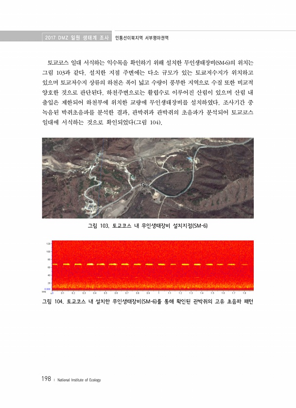 2017 DMZ 일원 생태계 조사 민통선이북지역 서부평야권역 198 ? National Institute of Ecology 그림 104. 토교코스 내 설치한 무인생태장비 SM-6 를 통해 확인된 관박쥐의 고유 초음파 패턴 토교코스 일대 서식하는 익수목을 확인하기 위해 설치한 무인생태장비 SM-6 의 위치는 그림 103과 같다. 설치한 지점 주변에는 다소 규모가 있는 토쿄저수지가 위치하고 있으며 토교저수지 상류의 하천은 폭이 넓고 수량이 풍부한 지역으로 수질 또한 비교적 양호한 것으로 판단된다. 하천주변으로는 활렵수로 이루어진 산림이 있으며 산림 내 출입은 제한되어 하천부에 위치한 교량에 무인생태장비를 설치하였다. 조사기간 중 녹음된 박쥐초음파를 분석한 결과, 관박쥐과 관박쥐의 초음파가 분석되어 토교코스 일...