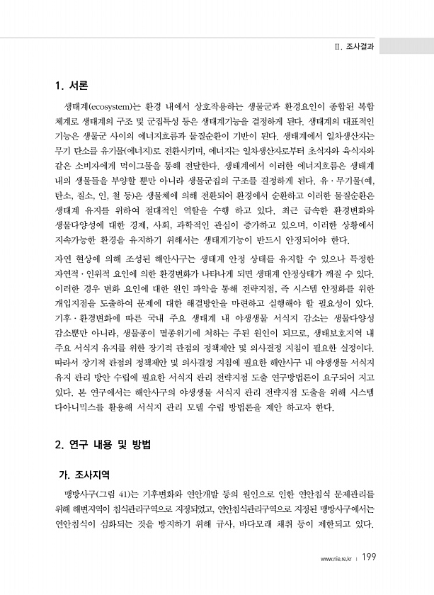 Ⅱ. 조사결과 www.nie.re.kr ? 199 1. 서론 생태계 ecosystem 는 환경 내에서 상호작용하는 생물군과 환경요인이 종합된 복합 체계로 생태계의 구조 및 군집특성 등은 생태계기능을 결정하게 된다. 생태계의 대표적인 기능은 생물군 사이의 에너지흐름과 물질순환이 기반이 된다. 생태계에서 일차생산자는 무기 탄소를 유기물 에너지 로 전환시키며, 에너지는 일차생산자로부터 초식자와 육식자와 같은 소비자에게 먹이그물을 통해 전달한다. 생태계에서 이러한 에너지흐름은 생태계 내의 생물들을 부양할 뿐만 아니라 생물군집의 구조를 결정하게 된다. 유·무기물 예, 탄소, 질소, 인, 철 등 은 생물체에 의해 전환되어 환경에서 순환하고 이러한 물질순환은 생태계 유지를 위하여 절대적인 역할을 수행 하고 있다. 최근 ...