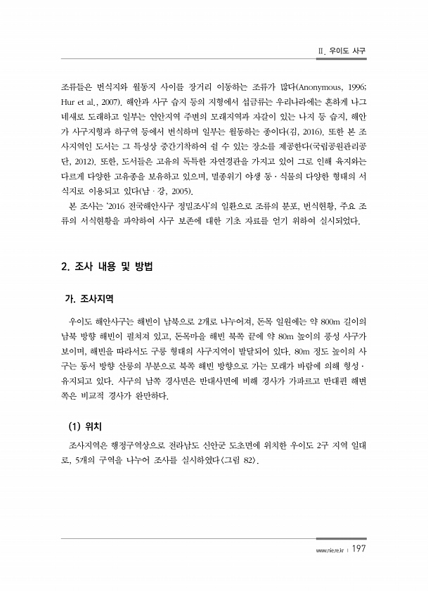 Ⅱ. 우이도 사구 www.nie.re.kr ? 197 조류들은 번식지와 월동지 사이를 장거리 이동하는 조류가 많다 Anonymous, 1996; Hur et al., 2007 해안과 사구 습지 등의 지형에서 섭금류는 우리나라에는 흔하게 나그 네새로 도래하고 일부는 연안지역 주변의 모래지역과 자갈이 있는 나지 등 습지, 해안 가 사구지형과 하구역 등에서 번식하며 일부는 월동하는 종이다 김, 2016 또한 본 조 사지역인 도서는 그 특성상 중간기착하여 쉴 수 있는 장소를 제공한다 국립공원관리공 단, 2012 또한, 도서들은 고유의 독특한 자연경관을 가지고 있어 그로 인해 육지와는 다르게 다양한 고유종을 보유하고 있으며, 멸종위기 야생 동·식물의 다양한 형태의 서 식지로 이용되고 있다 남ㆍ강, 2005 본 조사는...