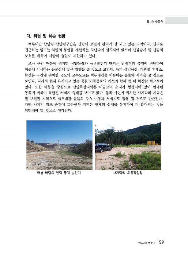 Ⅱ. 조사결과 www.nie.re.kr ? 199 다. 위험 및 훼손 현황 백두대간 삽당령-삽당령구간은 산림의 보전과 관리가 잘 되고 있는 지역이다. 산지로 접근하는 임도는 차량의 통행을 제한하는 차단막이 설치되어 있으며 산불감시 및 산림의 보호를 위하여 사람의 출입도 제한하고 있다. 조사 구간 매봉에 위치한 삼양목장과 풍력발전기 단지는 관광객의 통행이 빈번하여 이곳에 서식하는 동물상에 많은 영향을 줄 것으로 보인다. 특히 삼양목장, 대관령 휴게소, 능경봉 구간에 위치한 국도와 고속도로는 백두대간을 이동하는 동물에 제약을 줄 것으로 보인다. 따라서 현제 유지되고 있는 동물 이동통로의 개선과 함께 좀 더 확장할 필요성이 있다. 또한 매봉을 중심으로 삼양목장지역은 대규묘의 초지가 형성되어 있어 반대편 동쪽에 비...