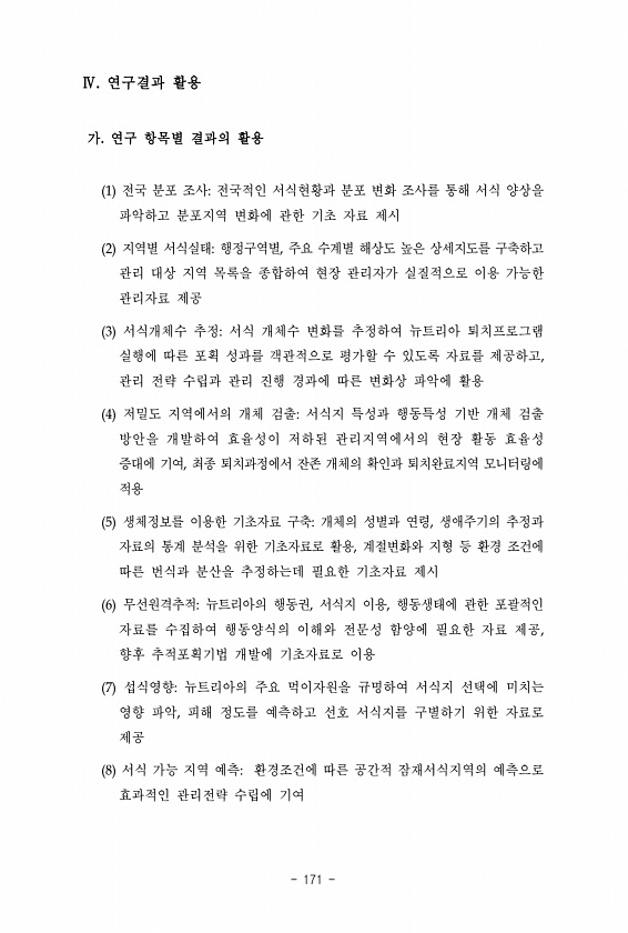 Ⅳ. 연구결과 활용 가. 연구 항목별 결과의 활용 1 전국 분포 조사전국적인 서식현황과 분포 변화 조사를 통해 서식 양상을 파악하고 분포지역 변화에 관한 기초 자료 제시 2 지역별 서식실태행정구역별, 주요 수계별 해상도 높은 상세지도를 구축하고 관리 대상 지역 목록을 종합하여 현장 관리자가 실질적으로 이용 가능한 관리자료 제공 3 서식개체수 추정서식 개체수 변화를 추정하여 뉴트리아 퇴치프로그램 실행에 따른 포획 성과를 객관적으로 평가할 수 있도록 자료를 제공하고, 관리 전략 수립과 관리 진행 경과에 따른 변화상 파악에 활용 4 저밀도 지역에서의 개체 검출서식지 특성과 행동특성 기반 개체 검출 방안을 개발하여 효율성이 저하된 관리지역에서의 현장 활동 효율성 증대에 기여, 최종 퇴치과정에서 잔존 개체의 확인과 ...