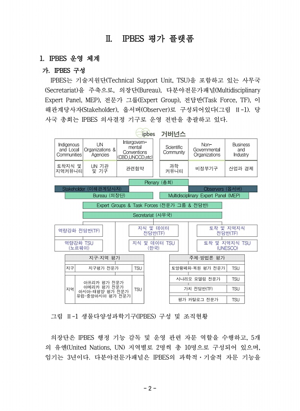 2 거버넌스 II. IPBES 평가 플랫폼 1. IPBES 운영 체계 가. IPBES 구성 IPBES는 기술지원단 Technical Support Unit, TSU 을 포함하고 있는 사무국 Secretariat 을 주축으로, 의장단 Bureau , 다분야전문가패널 Multidisciplinary Expert Panel, MEP , 전문가 그룹 Expert Group , 전담반 Task Force, TF , 이 해관계당사자 Stakeholder , 옵서버 Observer 로 구성되어있다 그림 Ⅱ-1 당 사국 총회는 IPBES 의사결정 기구로 운영 전반을 총괄하고 있다. 그림 Ⅱ-1 생물다양성과학기구 IPBES 구성 및 조직현황 의장단은 IPBES 행정 기능 감독 및 운영 관련 자문 역할을 수행하고, 5개 의 ...