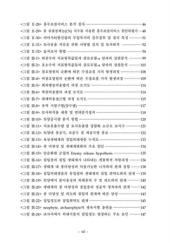 그림 홍수조절서비스 분석 절차 그림 물 유출잠재능 지수를 이용한 홍수조절서비스 원단위평가 그림 야마가타현산림과 무입목지의 강우침투 및 침식 특성 그림 토사유출 저감을 위한 사방댐 설치 및 토사퇴적 그림 습지조사 방법 그림 하천수의 지표항목값들과 클로로필 양과의 상관분석 그림 호소수의 지표항목값들과 클로로필 양과의 상관분석 그림 점오염원의 순환에 따른 수질조절 가치 발생과정 그림 비점오염원의 순환에 따른 수질조절 가치 발생과정 그림 회피행동비용법의 과정 모식도 그림 복원비용법의 과정 모식도 그림 대체비용접근법 과정 모식도 그림 유역 시험구법 양수댐 그림 토사퇴적물 채취 및 연대분석장치 그림 토양공극량 분석 방법 그림 지표유출수량 및 토사유출량 정량화 소규모 조사구 그림 토양내 총공극 조공극 및 세공극량 분포 ...