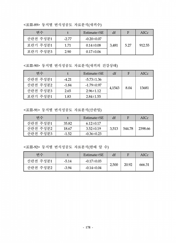 178 변수 t Estimate±SE df F AICc 산란전 주성분1 -2.77 -0.20±0.07 포란기 주성분1 1.71 0.14±0.08 3,481 5.27 912.55 포란기 주성분3 2.90 0.17±0.06 표Ⅲ-89 둥지별 번식성공도 자료분석 새끼수 변수 t Estimate±SE df F AICc 산란전 주성분1 -4.21 -5.73±1.36 4,1543 8.04 13681 산란전 주성분2 -1.84 -1.79±0.97 산란전 주성분3 2.65 2.96±1.12 포란기 주성분1 1.83 2.84±1.55 표Ⅲ-90 둥지별 번식성공도 자료분석 새끼의 건강상태 변수 t Estimate±SE df F AICc 산란전 주성분1 35.82 6.12±0.17 산란전 주성분2 18.67 3.52±0.19 ...