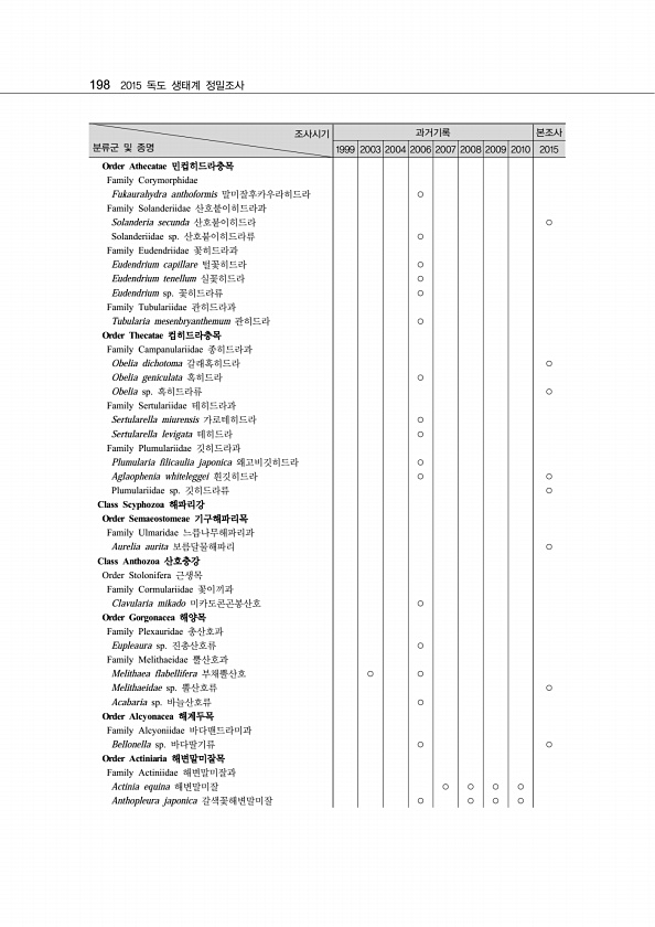 198 2015 독도 생태계 정밀조사 조사시기 분류군 및 종명 과거기록 본조사 1999 2003 2004 2006 2007 2008 2009 2010 2015 Order Athecatae 민컵히드라충목 Family Corymorphidae Fukaurahydra anthoformis 말미잘후카우라히드라 ○ Family Solanderiidae 산호붙이히드라과 Solanderia secunda 산호붙이히드라 ○ Solanderiidae sp. 산호붙이히드라류 ○ Family Eudendriidae 꽃히드라과 Eudendrium capillare 털꽃히드라 ○ Eudendrium tenellum 실꽃히드라 ○ Eudendrium sp. 꽃히드라류 ○ Family Tubulariidae 관히드라과 Tubulari...