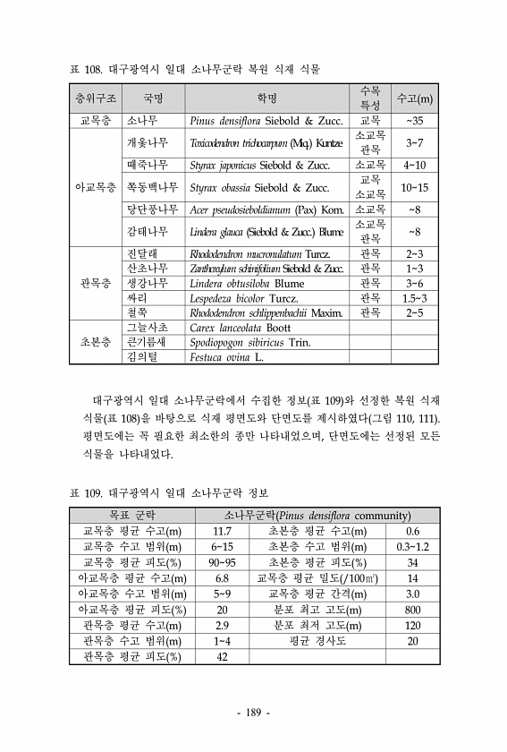 층위구조 국명 학명 수목 특성 수고 m 교목층 소나무 Pinus densiflora Siebold & Zucc. 교목 35 아교목층 개옻나무 Toxicodendron trichocarpum Miq. Kuntze 소교목 관목 37 때죽나무 Styrax japonicus Siebold & Zucc. 소교목 410 쪽동백나무 Styrax obassia Siebold & Zucc. 교목 소교목 1015 당단풍나무 Acer pseudosieboldianum Pax Kom. 소교목 8 감태나무 Lindera glauca Siebold & Zucc. Blume 소교목 관목 8 관목층 진달래 Rhododendron mucronulatum Turcz. 관목 23 산초나무 Zanthoxylum schinifolium Sieb...