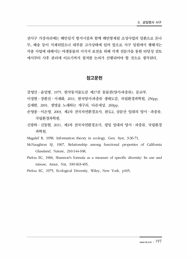Ⅱ. 금일명사 사구 www.nie.re.kr ? 197 전사구 가장자리에는 해안침식 방지시설과 함께 해안방재림 조성사업의 일환으로 돈나 무, 해송 등이 식재되었으나 대부분 고사상태에 있어 앞으로 사구 일원에서 행해지는 각종 사업에 대해서는 야생동물의 서식지 보전을 위해 각계 전문가를 통한 타당성 검토 에서부터 사후 관리에 이르기까지 철저한 논의가 선행되어야 할 것으로 생각된다. 참고문헌 강영선·윤일병. 1975. 한국동식물도감 제17권 동물편 양서?파충류 문교부. 이정현·장환진·서재화. 2011. 한국양서?파충류 생태도감. 국립환경과학원. 256pp. 심재한. 2001. 생명을 노래하는 개구리. 다른세상. 269pp. 손영종·이은영. 2003. 제2차 전국자연환경조사. 완도2, 삼문산 일대의 양서·파충류. ...
