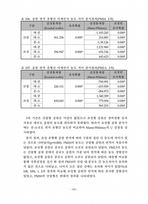 191 구분 검정통계량 유의확률 검정통계량 조정된 유의확률 산림 대 중 대 소 중 소 조성 대 중 대 소 중 소 표 공원 면적 유형간 미세먼지 농도 차이 분석결과 차 구분 검정통계량 유의확률 검정통계량 조정된 유의확률 산림 대 중 대 소 중 소 조성 대 중 대 소 중 소 표 공원 면적 유형간 미세먼지 농도 차이 분석결과 차 차 기간은 산림형 공원은 이상이 없었으나 조성형 공원은 장비결함 등의 사유로 대규모 공원의 농도를 취득하지 못하였다 따라서 조성형 공원 분석시 에는 중 소규모 면적 유형간 농도만 비교하여 의 검정을 실 시하였다 분석 결과 조성 유형별 공원 면적에 따라 구분된 집단 간 농도에 차이가 있 는 것으로 나타났다 의 농도는 산림형 공원의 면적이 작을수록 낮았다 조성형 공원은 중규모 공원이 소규모 ...
