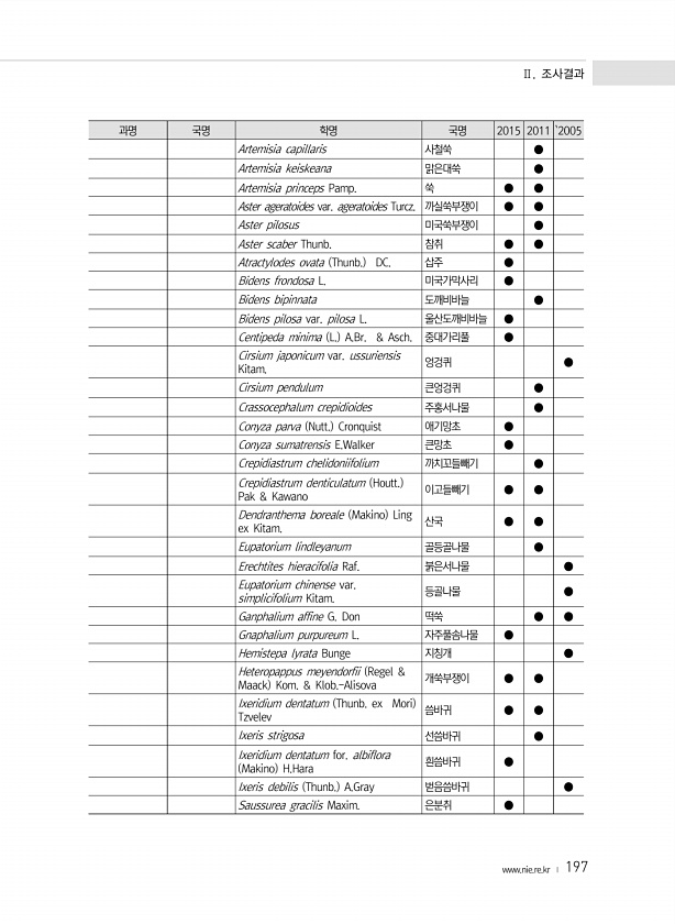 Ⅱ. 조사결과 www.nie.re.kr ? 197 과명 국명 학명 국명 2015 2011 `2005 Artemisia capillaris 사철쑥 ● Artemisia keiskeana 맑은대쑥 ● Artemisia princeps Pamp. 쑥 ● ● Aster ageratoides var. ageratoides Turcz. 까실쑥부쟁이 ● ● Aster pilosus 미국쑥부쟁이 ● Aster scaber Thunb. 참취 ● ● Atractylodes ovata Thunb. DC. 삽주 ● Bidens frondosa L. 미국가막사리 ● Bidens bipinnata 도깨비바늘 ● Bidens pilosa var. pilosa L. 울산도깨비바늘 ● Centipeda minima L. A.Br. & A...