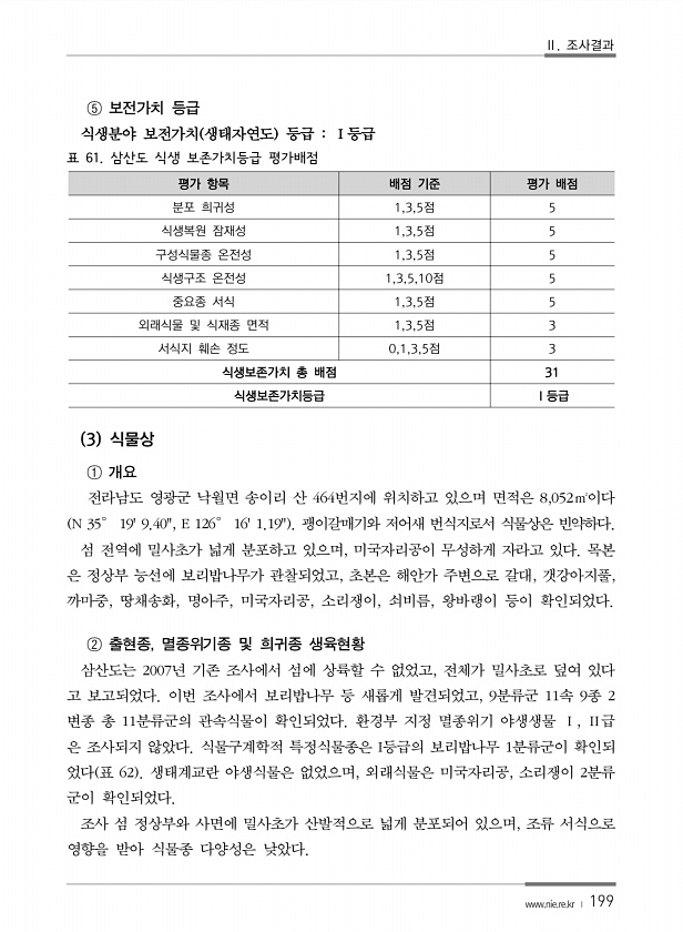 Ⅱ. 조사결과 www.nie.re.kr ? 199 ⑤ 보전가치 등급 식생분야 보전가치 생태자연도 등급 Ⅰ등급 표 61. 삼산도 식생 보존가치등급 평가배점 평가 항목 배점 기준 평가 배점 분포 희귀성 1,3,5점 5 식생복원 잠재성 1,3,5점 5 구성식물종 온전성 1,3,5점 5 식생구조 온전성 1,3,5,10점 5 중요종 서식 1,3,5점 5 외래식물 및 식재종 면적 1,3,5점 3 서식지 훼손 정도 0,1,3,5점 3 식생보존가치 총 배점 31 식생보존가치등급 Ⅰ등급 3 식물상 ① 개요 전라남도 영광군 낙월면 송이리 산 464번지에 위치하고 있으며 면적은 8,052㎡이다 N 35° 199.40, E 126° 161.19괭이갈매기와 저어새 번식지로서 식물상은 빈약하다. 섬 전역에 밀사초가 넓게 분포하고 있...