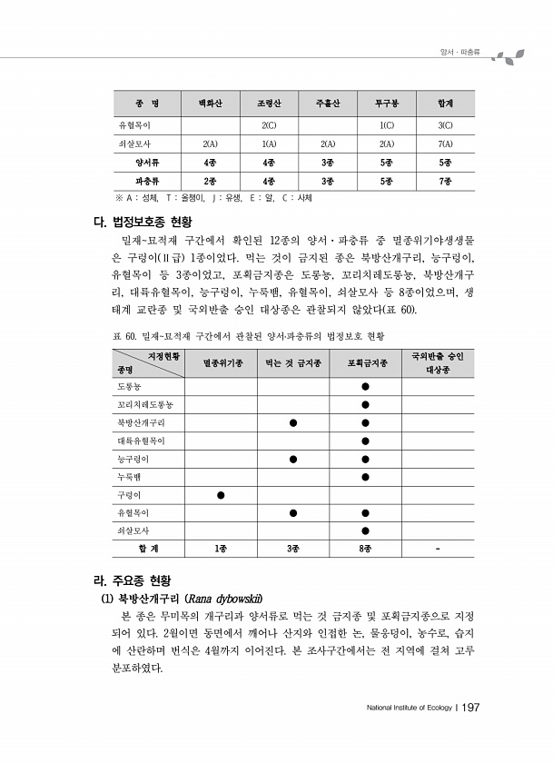 양서ㆍ파충류 National Institute of EcologyⅠ197 종 명 백화산 조령산 주흘산 투구봉 합계 유혈목이 2 C 1 C 3 C 쇠살모사 2 A 1 A 2 A 2 A 7 A 양서류 4종 4종 3종 5종 5종 파충류 2종 4종 3종 5종 7종 ※ A 성체, T 올챙이, J 유생, E 알, C 사체 다. 법정보호종 현황 밀재묘적재 구간에서 확인된 12종의 양서·파충류 중 멸종위기야생생물 은 구렁이 Ⅱ급 1종이었다. 먹는 것이 금지된 종은 북방산개구리, 능구렁이, 유혈목이 등 3종이었고, 포획금지종은 도롱뇽, 꼬리치레도롱뇽, 북방산개구 리, 대륙유혈목이, 능구렁이, 누룩뱀, 유혈목이, 쇠살모사 등 8종이었으며, 생 태계 교란종 및 국외반출 승인 대상종은 관찰되지 않았다 표 60 지정현황 종명 멸종...