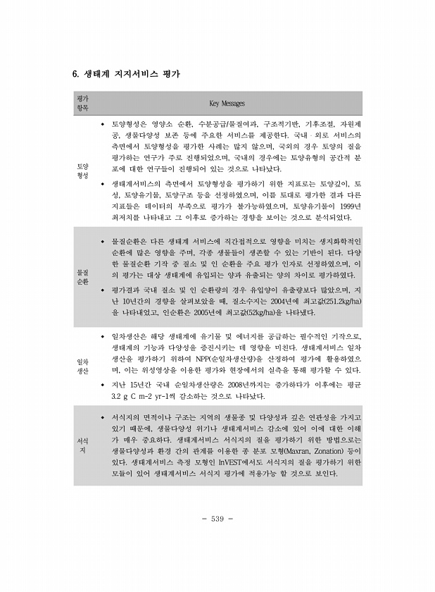539 6. 생태계 지지서비스 평가 평가 항목 Key Messages 토양 형성 ? 토양형성은 영양소 순환, 수분공급/물질여과, 구조적기반, 기후조절, 자원제 공, 생물다양성 보존 등에 주요한 서비스를 제공한다. 국내?외로 서비스의 측면에서 토양형성을 평가한 사례는 많지 않으며, 국외의 경우 토양의 질을 평가하는 연구가 주로 진행되었으며, 국내의 경우에는 토양유형의 공간적 분 포에 대한 연구들이 진행되어 있는 것으로 나타났다. ? 생태계서비스의 측면에서 토양형성을 평가하기 위한 지표로는 토양깊이, 토 성, 토양유기물, 토양구조 등을 선정하였으며, 이를 토대로 평가한 결과 다른 지표들은 데이터의 부족으로 평가가 불가능하였으며, 토양유기물이 1999년 최저치를 나타내고 그 이후로 증가하는 경향을 보이는 것으로 ...