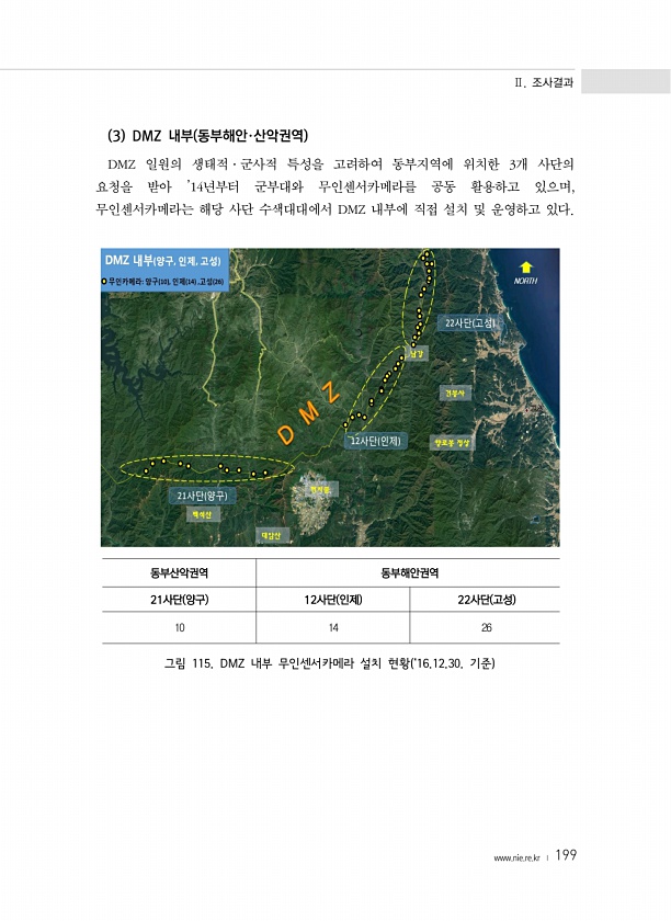 Ⅱ. 조사결과 www.nie.re.kr ? 199 3 DMZ 내부 동부해안·산악권역 DMZ 일원의 생태적·군사적 특성을 고려하여 동부지역에 위치한 3개 사단의 요청을 받아 ’14년부터 군부대와 무인센서카메라를 공동 활용하고 있으며, 무인센서카메라는 해당 사단 수색대대에서 DMZ 내부에 직접 설치 및 운영하고 있다. 동부산악권역 동부해안권역 21사단 양구 12사단 인제 22사단 고성 10 14 26 그림 115. DMZ 내부 무인센서카메라 설치 현황 ‘16.12.30. 기준
