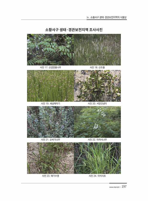 iv. 소황사구 생태·경관보전지역의 식물상 www.nie.re.kr ?197 사진 17. 산검양옻나무 사진 18. 산조풀 사진 19. 새섬매자기 사진 20. 서양갓냉이 사진 21. 순비기나무 사진 22. 아까시나무 사진 23. 애기수영 사진 24. 이삭사초