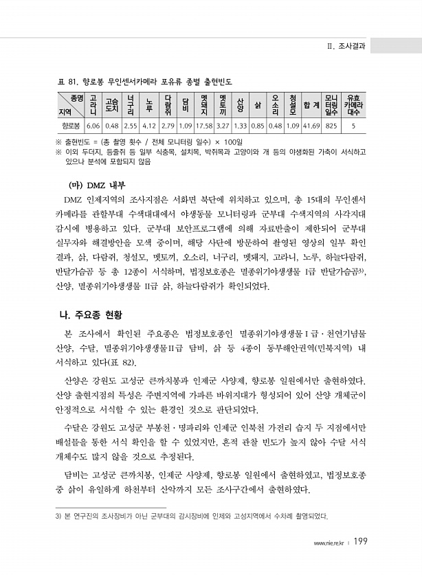 Ⅱ. 조사결과 www.nie.re.kr ? 199 종명 지역 고라니 고슴 도치 너구리 노루 다람쥐 담비 멧돼지 멧토끼 산양 삵 오소리 청설모 합 계 모니 터링 일수 유효 카메라 대수 향로봉 6.06 0.48 2.55 4.12 2.79 1.09 17.58 3.27 1.33 0.85 0.48 1.09 41.69 825 5 표 81. 향로봉 무인센서카메라 포유류 종별 출현빈도 ※ 출현빈도 = 총 촬영 횟수 전체 모니터링 일수 × 100일 ※ 이외 두더지, 등줄쥐 등 일부 식충목, 설치목, 박쥐목과 고양이와 개 등의 야생화된 가축이 서식하고 있으나 분석에 포함되지 않음 마 DMZ 내부 DMZ 인제지역의 조사지점은 서화면 북단에 위치하고 있으며, 총 15대의 무인센서 카메라를 관할부대 수색대대에서 야생동물 모니터링과...