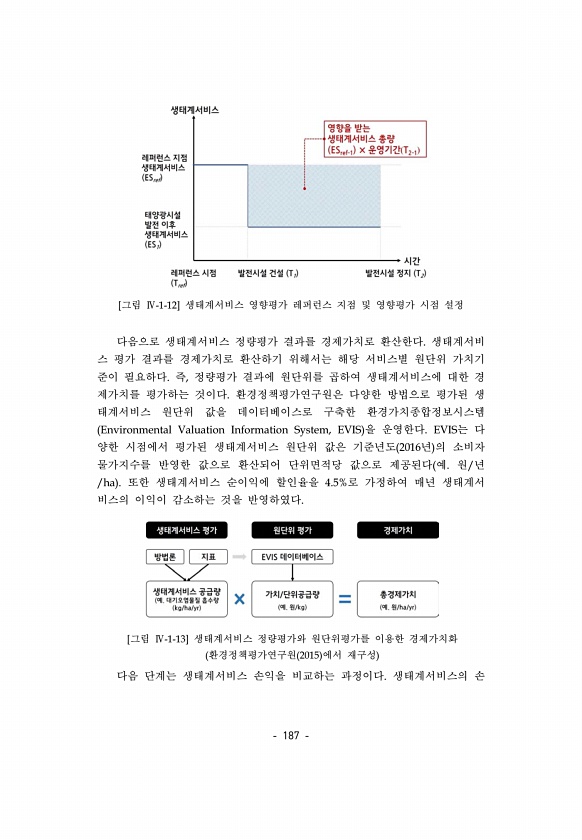 187 [그림 Ⅳ-1-12] 생태계서비스 영향평가 레퍼런스 지점 및 영향평가 시점 설정 다음으로 생태계서비스 정량평가 결과를 경제가치로 환산한다. 생태계서비 스 평가 결과를 경제가치로 환산하기 위해서는 해당 서비스별 원단위 가치기 준이 필요하다. 즉, 정량평가 결과에 원단위를 곱하여 생태계서비스에 대한 경 제가치를 평가하는 것이다. 환경정책평가연구원은 다양한 방법으로 평가된 생 태계서비스 원단위 값을 데이터베이스로 구축한 환경가치종합정보시스템 Environmental Valuation Information System, EVIS 을 운영한다. EVIS는 다 양한 시점에서 평가된 생태계서비스 원단위 값은 기준년도 2016년 의 소비자 물가지수를 반영한 값으로 환산되어 단위면적당 값으로 제공된다 예. 원/년 /...