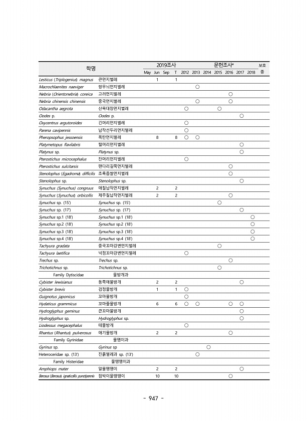 947 학명 2019조사 문헌조사* 보호 May Jun Sep T 2012 2013 2014 2015 2016 2017 2018 종 Lesticus Triplogenius magnus 큰먼지벌레 1 1 Macrochlaenites naeviger 쌍무늬먼지벌레 ? Nebria Orientonebria coreica 고려먼지벌레 ? Nebria chinensis chinensis 중국먼지벌레 ? ? Odacantha aegrota 산목대장먼지벌레 ? ? Oodes p. Oodes p. ? Oxycentrus argutoroides 긴머리먼지벌레 ? Parena cavipennis 납작선두리먼지벌레 ? Pheropsophus jessoensis 폭탄먼지벌레 8 8 ? ? Platymetopus flavilabr...