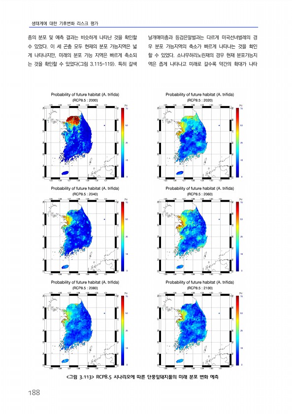 생태계에 대한 기후변화 리스크 평가 188 종의 분포 및 예측 결과는 비슷하게 나타난 것을 확인할 수 있었다. 이 세 곤충 모두 현재의 분포 가능지역은 넓 게 나타나지만, 미래의 분포 가능 지역은 빠르게 축소되 는 것을 확인할 수 있었다 그림 3.115119 특히 갈색 날개매미충과 등검은말벌과는 다르게 미국선녀벌레의 경 우 분포 가능지역의 축소가 빠르게 나타나는 것을 확인 할 수 있었다. 소나무허리노린재의 경우 현재 분포가능지 역은 좁게 나타나고 미래로 갈수록 약간의 확대가 나타 그림 3.113 RCP8.5 시나리오에 따른 단풍잎돼지풀의 미래 분포 변화예측