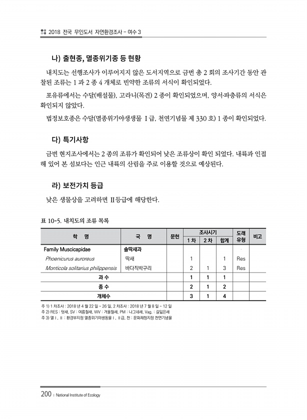 2018 전국 무인도서 자연환경조사 여수 3 200 ? National Institute of Ecology , 내치도는 선행조사가 이루어지지 않은 도서지역으로 금번 총 2 회의 조사기간 동안 관 찰된 조류는 1 과 2 종 4 개체로 빈약한 조류의 서식이 확인되었다. 포유류에서는 수달 배설물 , 고라니 목견 2 종이 확인되었으며, 양서?파충류의 서식은 확인되지 않았다. 법정보호종은 수달 멸종위기야생생물 Ⅰ급, 천연기념물 제 330 호 1 종이 확인되었다. 금번 현지조사에서는 2 종의 조류가 확인되어 낮은 조류상이 확인 되었다. 내륙과 인접 해 있어 본 섬보다는 인근 내륙의 산림을 주로 이용할 것으로 예상된다. 낮은 생물상을 고려하면 Ⅱ등급에 해당한다. 학 명 국 명 문헌 조사시기 도래 1 차 2 차 합계 유...
