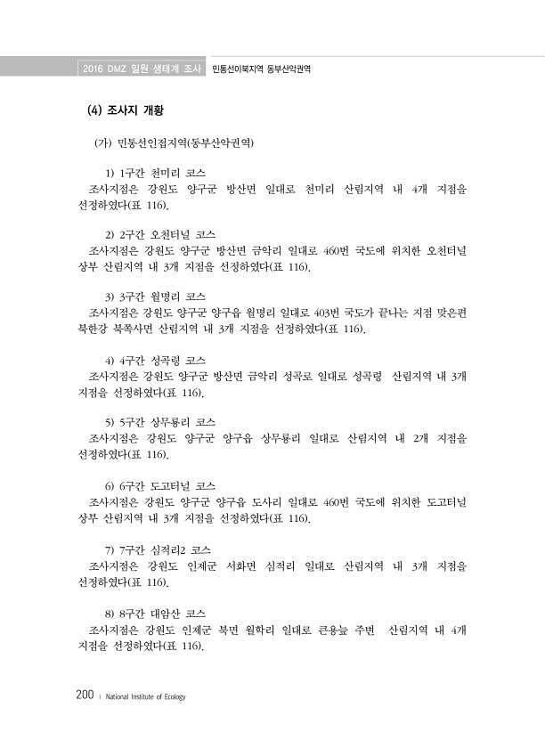 2016 DMZ 일원 생태계 조사 민통선이북지역 동부산악권역 200 ? National Institute of Ecology 4 조사지 개황 가 민통선인접지역 동부산악권역 1 1구간 천미리 코스 조사지점은 강원도 양구군 방산면 일대로 천미리 산림지역 내 4개 지점을 선정하였다 표 116 2 2구간 오천터널 코스 조사지점은 강원도 양구군 방산면 금악리 일대로 460번 국도에 위치한 오천터널 상부 산림지역 내 3개 지점을 선정하였다 표 116 3 3구간 월명리 코스 조사지점은 강원도 양구군 양구읍 월명리 일대로 403번 국도가 끝나는 지점 맞은편 북한강 북쪽사면 산림지역 내 3개 지점을 선정하였다 표 116 4 4구간 성곡령 코스 조사지점은 강원도 양구군 방산면 금악리 성곡로 일대로 성곡령 산림지역 내 3개 지...