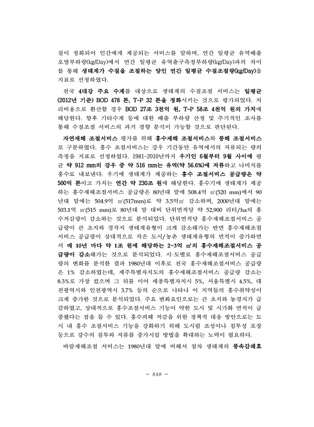 848 질이 정화되어 인간에게 제공되는 서비스를 말하며, 연간 일평균 유역배출 오염부하량 kg/Day 에서 연간 일평균 유역출구측정부하량 kg/Day 과의 차이 를 통해 생태계가 수질을 조절하는 양인 연간 일평균 수질조절량 kg/Day 을 지표로 선정하였다. 전국 4대강 주요 수계를 대상으로 생태계의 수질조절 서비스는 일평균 2012년 기준 BOD 478 톤, T-P 32 톤을 정화시키는 것으로 평가되었다. 처 리비용으로 환산할 경우 BOD 27조 3천억 원, T-P 58조 4천억 원의 가치에 해당한다. 향후 기타수계 등에 대한 배출 부하량 산정 및 주기적인 조사를 통해 수질조절 서비스의 과거 경향 분석이 가능할 것으로 판단된다. 자연재해 조절서비스 평가를 위해 홍수재해 조절서비스와 풍해 조절서비스 로 구분...