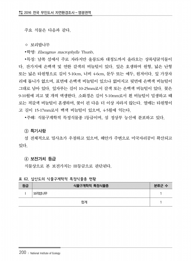 2016 전국 무인도서 자연환경조사 영광권역 200 ? National Institute of Ecology 주요 식물은 다음과 같다. ◇ 보리밥나무 ?학명Elaeagnus macrophylla Thunb. ?특징남쪽 섬에서 주로 자라지만 울릉도와 대청도까지 올라오는 상록덩굴식물이 다. 잔가지에 은백색 및 연한 갈색의 비늘털이 있다. 잎은 호생하며 원형, 넓은 난형 또는 넓은 타원형으로 길이 5-10cm, 너비 4-6cm, 둔두 또는 예두, 원저이다. 잎 가장자 리에 톱니가 없으며, 표면에 은백색 비늘털이 있으나 없어지고 뒷면에 은백색 비늘털이 그대로 남아 있다. 잎자루는 길이 10-25mm로서 갈색 또는 은백색 비늘털이 있다. 꽃은 9-10월에 피고 몇 개씩 액생한다. 소화경은 길이 5-10mm로서 흰 비...