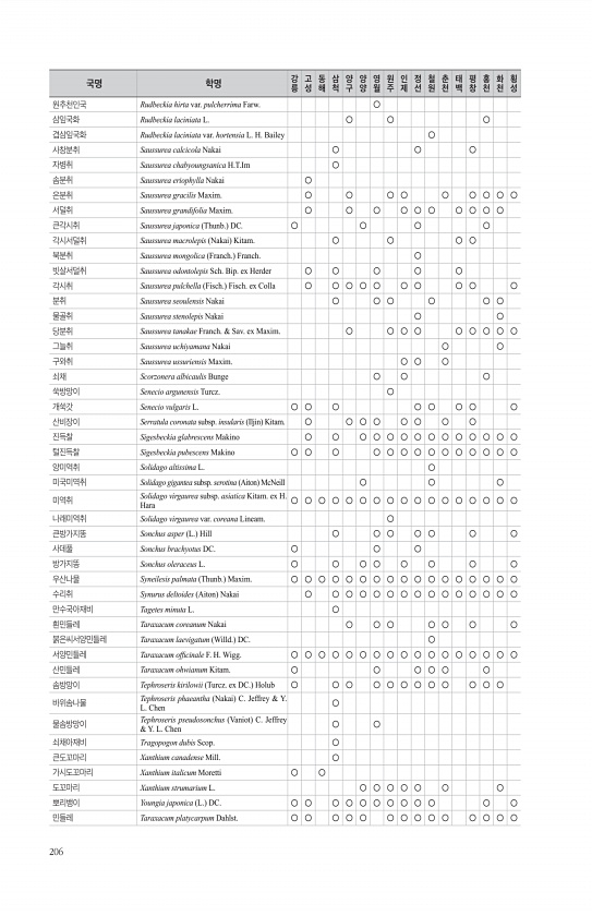 206 원추천인국 Rudbeckia hirta var. pulcherrima Farw. ○ 삼잎국화 Rudbeckia laciniata L. ○ ○ ○ 겹삼잎국화 Rudbeckia laciniata var. hortensia L. H. Bailey ○ 사창분취 Saussurea calcicola Nakai ○ ○ ○ 자병취 Saussurea chabyoungsanica H.T.Im ○ 솜분취 Saussurea eriophylla Nakai ○ 은분취 Saussurea gracilis Maxim. ○ ○ ○ ○ ○ ○ ○ ○ ○ 서덜취 Saussurea grandifolia Maxim. ○ ○ ○ ○ ○ ○ ○ ○ ○ ○ 큰각시취 Saussurea japonica Thunb. DC. ○ ○ ○ ○ 각시서덜취 ...