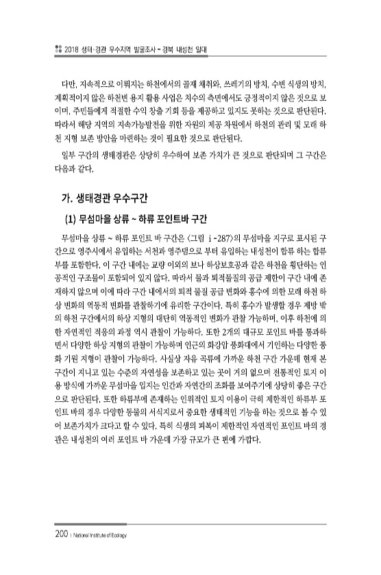 2018 생태·경관 우수지역 발굴조사 경북 내성천 일대 200 ? National Institute of Ecology 다만, 지속적으로 이뤄지는 하천에서의 골재 채취와, 쓰레기의 방치, 수변 식생의 방치, 계획적이지 않은 하천변 용지 활용 사업은 치수의 측면에서도 긍정적이지 않은 것으로 보 이며, 주민들에게 적절한 수익 창출 기회 등을 제공하고 있지도 못하는 것으로 판단된다. 따라서 해당 지역의 지속가능발전을 위한 자원의 제공 차원에서 하천의 관리 및 모래 하 천 지형 보존 방안을 마련하는 것이 필요한 것으로 판단된다. 일부 구간의 생태경관은 상당히 우수하여 보존 가치가 큰 것으로 판단되며 그 구간은 다음과 같다. 1 무섬마을 상류 하류 포인트 바 구간은 그림 ⅰ-287 의 무섬마을 지구로 표시된 구 간으...