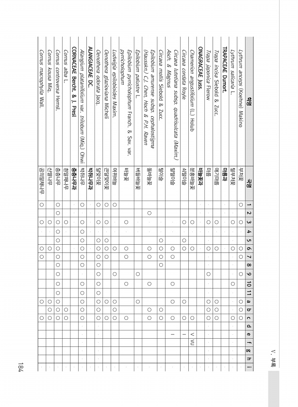 Ⅴ. 부록 184 학명 국명 1 2 3 4 5 6 7 8 9 10 11 a b c d e f g h i Lythrum anceps Koehne Makino 부처꽃 ○ ○ ○ ○ ○ ○ ○ ○ Lythrum salicaria L. 털부처꽃 ○ ○ ○ ○ TRAPACEAE Dumort. 마름과 Trapa incisa Siebold & Zucc. 애기마름 ○ ○ ○ ○ ○ Trapa japonica Flerow 마름 ○ ○ ○ ○ ○ ○ ONAGRACEAE Juss. 바늘꽃과 Chamerion angustifolium L. Holub 분홍바늘꽃 ○ ○ ○ Ⅴ VU Circaea cordata Royle 쇠털이슬 ○ ○ ○ ○ ○ Ⅰ Circaea lutetiana subsp. quadrisulcata Maxim....